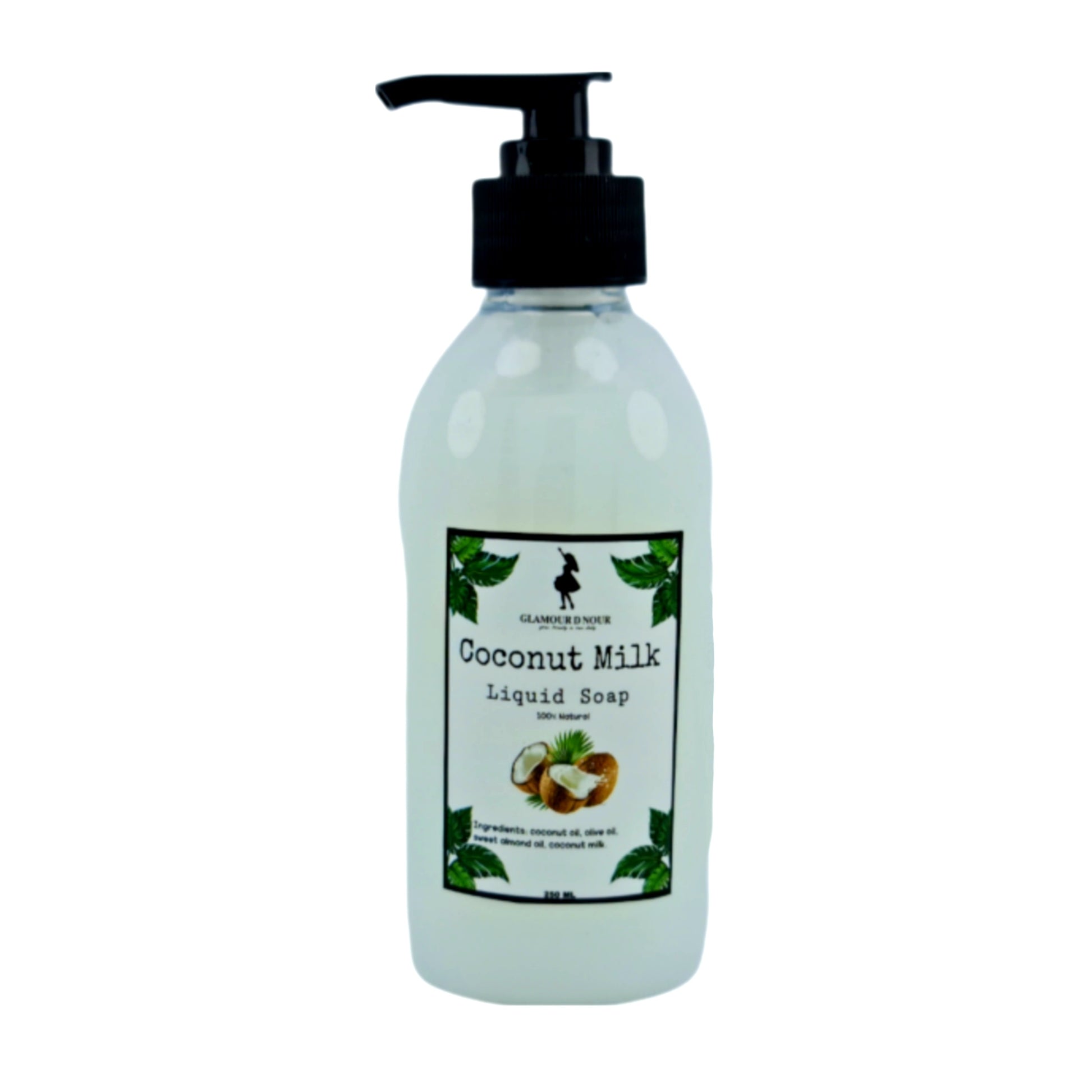 صابون سائل مرطب بحليب جوز الهند من Glamour مصنوع من حليب جوز الهند اللذيذ من المناطق الاستوائية وزيت المشمش لتنظيف وترطيب البشرة بلطف.