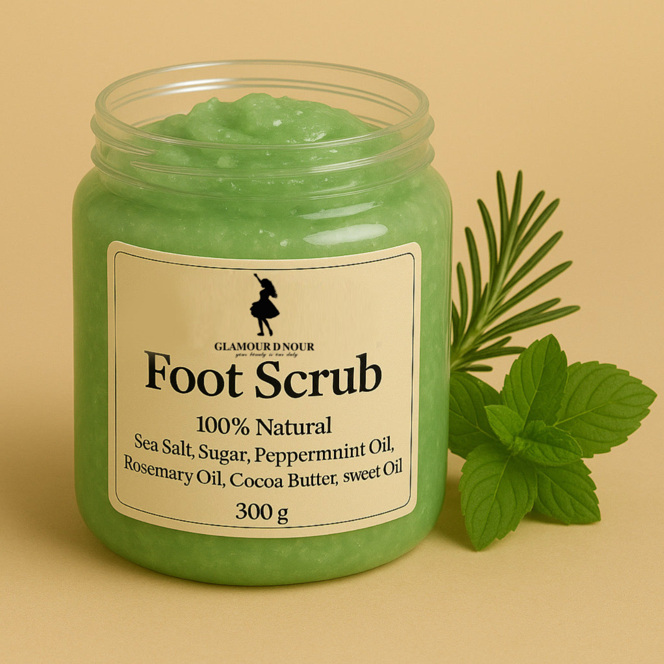دللي قدميك باستخدام مقشر القدمين الفاخر من Glamour D Nour، المصنوع من مكونات طبيعية 100% بما في ذلك ملح البحر والسكر وزيت إكليل الجبل وزيت النعناع وزبدة الكاكاو وزيت اللوز الحلو.